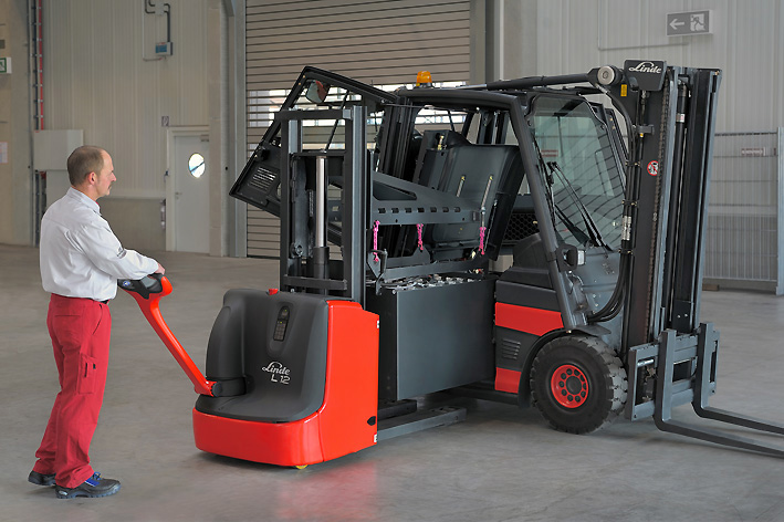 Som batteriskiftesystem til Linde maskiner kan man vælge mellem Linde palleløftere og gaffeltruck eller kranløsning til et smidigt batteriskifte.