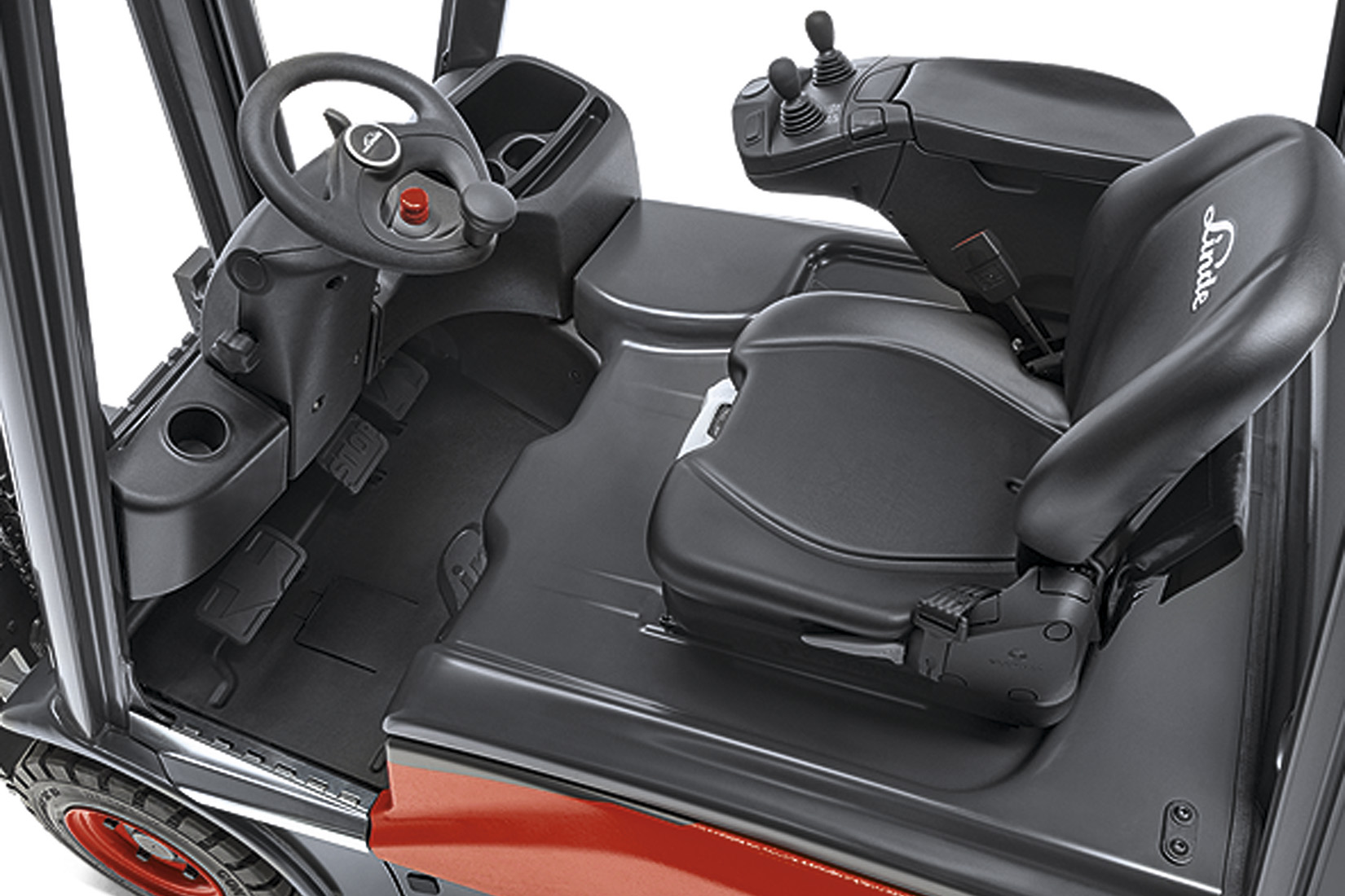 For at den interne transport altid foregår sikkert under disse forhold har Linde optimeret udsynet fra de elektriske truck. For eksempel giver den særligt smalle A-stolpe og de indlejrede mastprofiler et fremragende udsyn over lasten og omgivelserne. Den lave frontplade forbedrer også udsynet til både last og gafler. Som ekstraudstyr kan du vælge et panorama-glastag uden tværstænger som giver endnu bedre udsyn under løft.