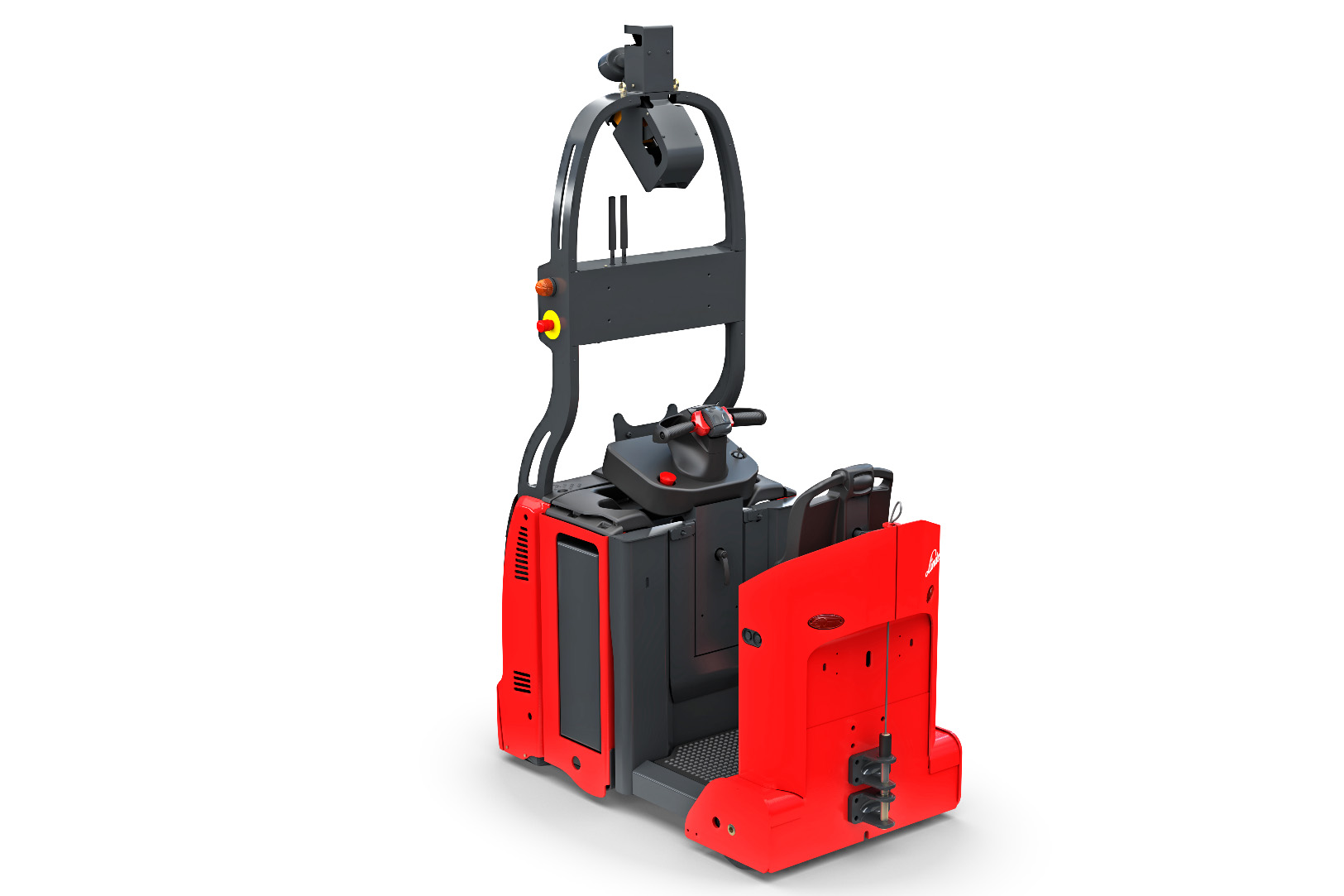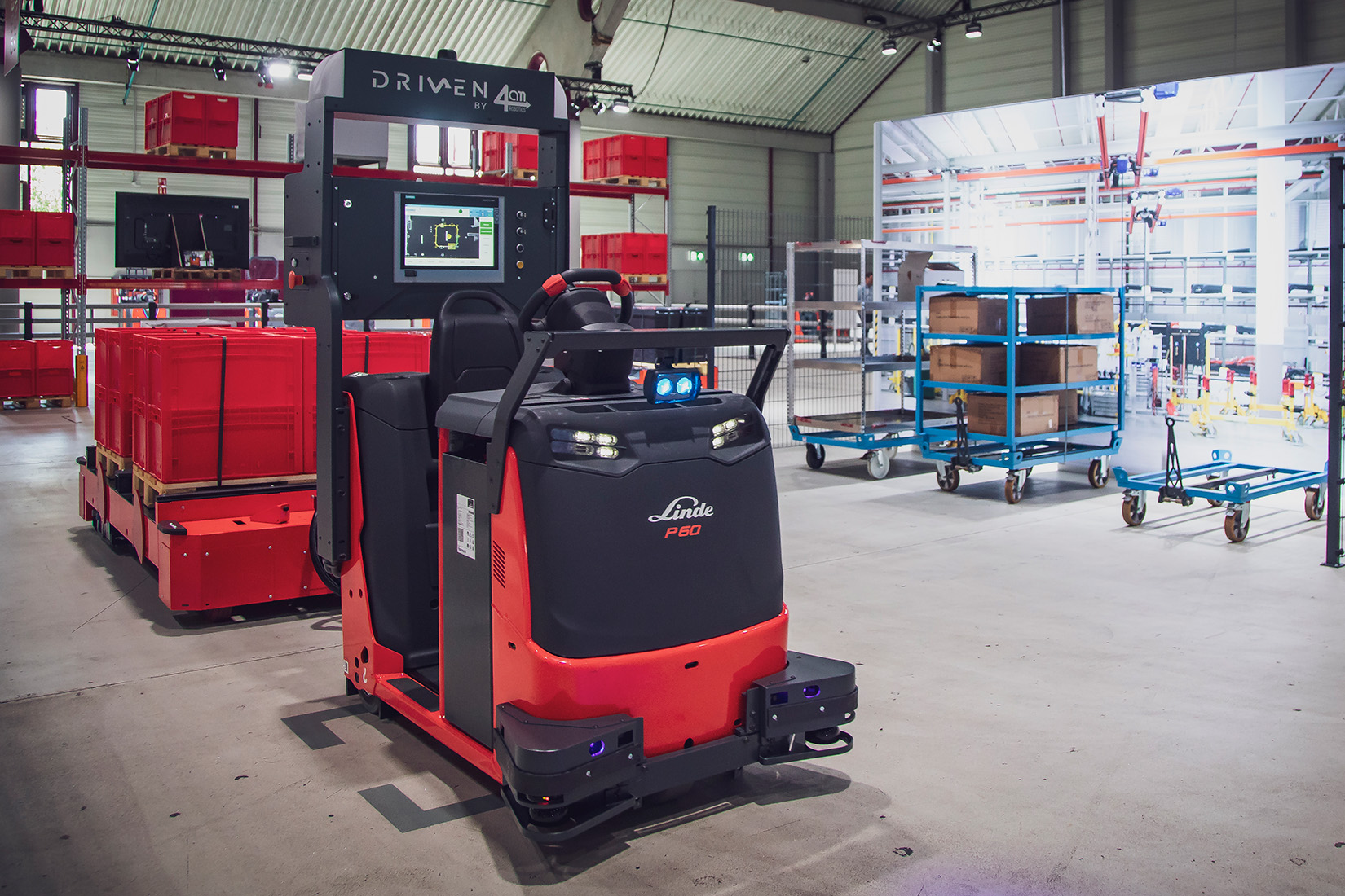 Linde P-MATIC AGV el-trækker med førerplatform er designet til lasttransport i arbejdsområder med begrænset plads. Den kan flytte last på mellem 3000 og 5000 kilogram.